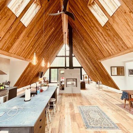 Perched quietly in the woods above Black Rock, a striking pair of A-frames rises from the landscape — familiar in silhouette, yet distinctly bespoke. What began as a Den Outdoors prefab plan evolved into a highly customized home that balances modern Nordic restraint with rugged Hudson Valley materiality.