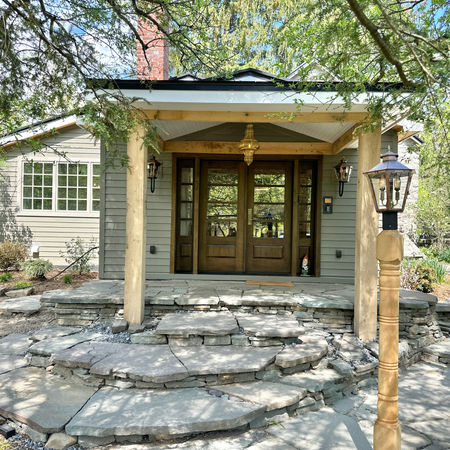 On the exterior, the approach was equally intentional. Pre-finished Hardie siding and high-performance Pella windows were selected to reduce long-term maintenance without sacrificing character. New stone pathways and patios shape the landscape, while carefully placed outdoor lighting extends the home’s presence into the evening. Hand-crafted shutters and a custom white oak double front door complete the envelope — a quiet statement of arrival that feels both timeless and personal.